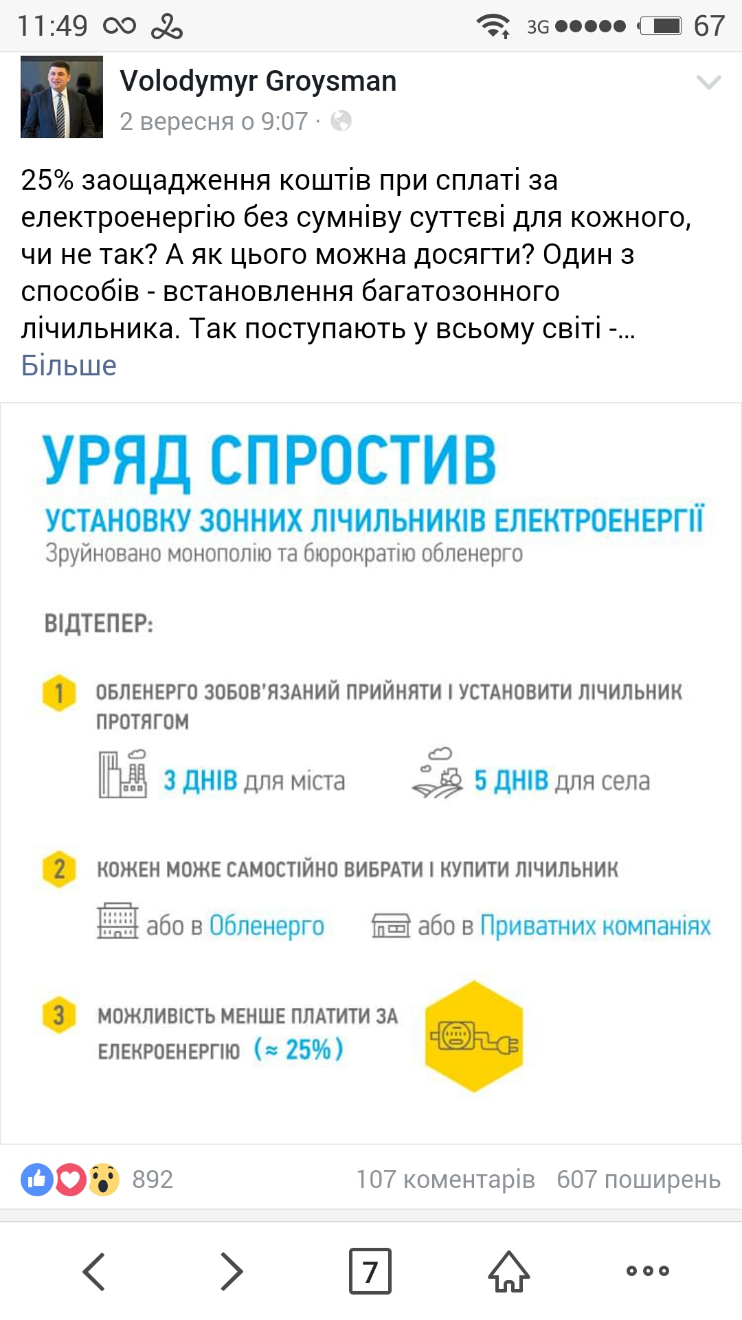 "Хочу запевнити, що Уряд буде і далі пропонувати і підтримувати ті рішення, які сприятимуть запровадженню справжньої енергоефективності - запобіганню марного витрачання усіма нами коштів і енергії." - Про це Володимир Гройсман написав на своїй сторінці в Facebook