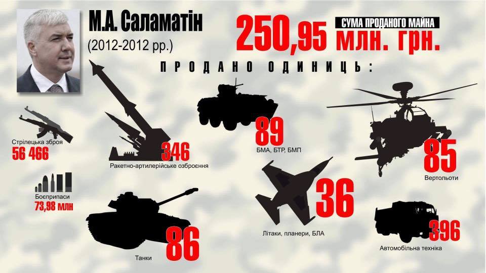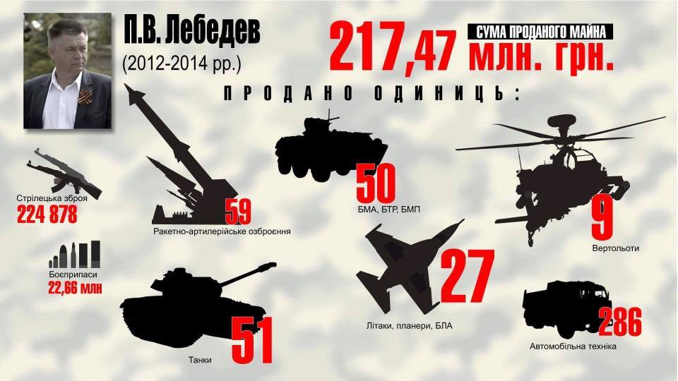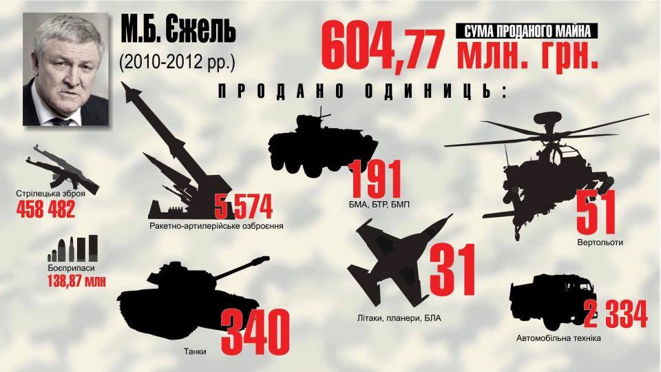 Як відомо, днями ГПУ заявила про початок розслідування фактів доведення армії до небоєздатного стану міністрами оборони, що обіймали цю посаду до 2014 року. До вашої уваги інфографіка, скільки військового майна і на яку суму в доларах було продано за час перебування на посаді кожного міністра. Сума в доларах розрахована згідно з курсом НБУ у відповідні роки. Пальму першості тут впевнено тримає Анатолій Гриценко, який продав на суму, більшу ніж всі інші міністри разом узяті.
