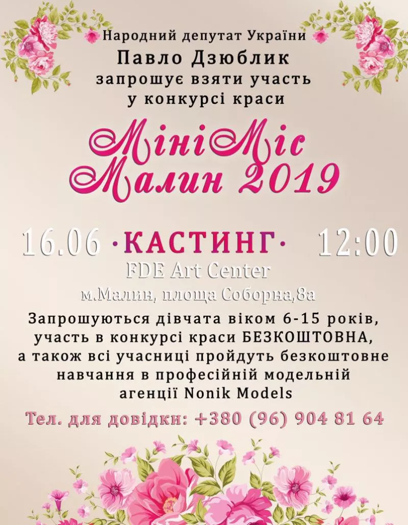 Народний депутат України Павло Дзюблик запрошує взяти участь у конкурсі краси "МініМіс Малин 2019". Запрошуються дівчата віком 6-15, участь в конкурсі безкоштовна. Також всі учасниці пройдуть безкоштовне навчання у професійній модельній агенції "Nonik Models".