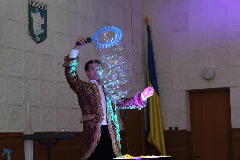 За сприяння депутата Житомирської обласної ради, генерального директора ТОВ «Юнігран» Сергія Диняка близько п’ятисот обдарованих, позбавлених батьківського піклування дітей, дітей працівників групи компаній «Юнігран», а також дітей, батьки яких приймали участь в антитерористичні й операції на сході України, мали змогу поринути у феєричний світ казки, де добро, як завжди, перемагає зло, у фантастичне царство фокусів та незвідану і непередбачувану природу створення і руху мильних кульок.
