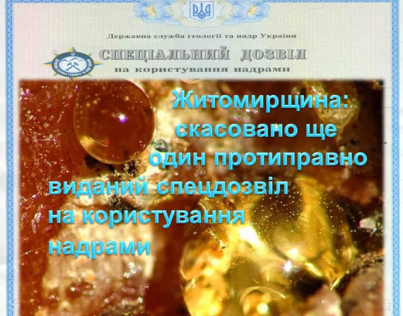 До відома: усього у 2017 році прокуратурою Житомирської області в інтересах держави та Житомирської обласної ради заявлено 6 аналогічних позовів про скасування незаконних дозволів на здійснення геологічного вивчення, у тому числі дослідно-промислової розробки ділянок надр бурштину площею понад 18 тис га, що розташовані у північних районах області. На даний час вже задоволено 5 позовів на загальну площу понад 16 тис га.