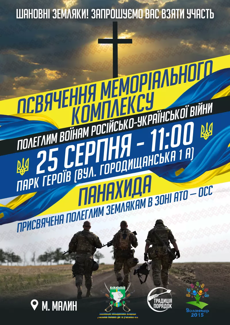 Малинчан та гостей міста запрошують взяти участь в освяченні меморіального комплексу полеглим воїнам російсько-української війни та у панахиді в пам'ять про земляків, які загинули в зоні АТО-ООС. Захід відбудеться 25 серпня об 11:00 у парку Героїв російсько-української війни за адресою: вул. Городищанська, 1а (поблизу газового господарства).