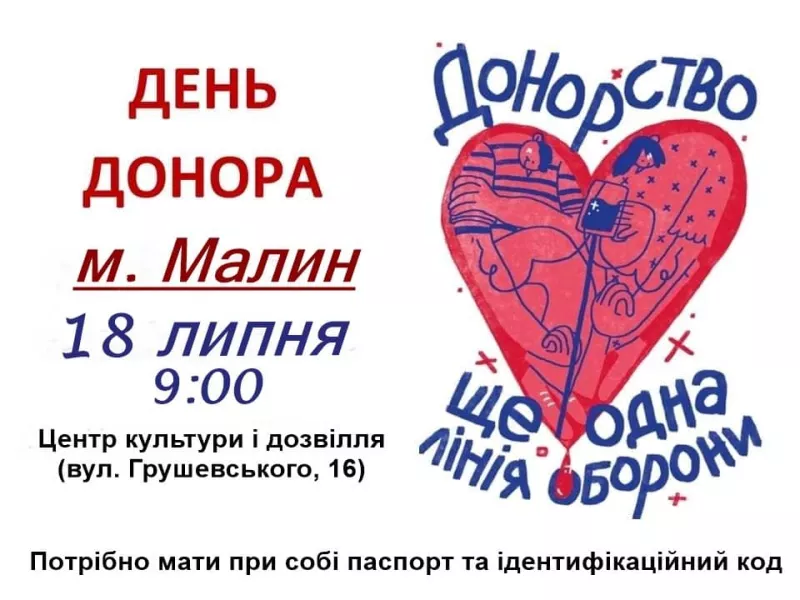 Збір крові проводитиметься із 9:00 у приміщенні Центру культури і дозвілля за адресою: м. Малин, вул. Грушевського, 16.