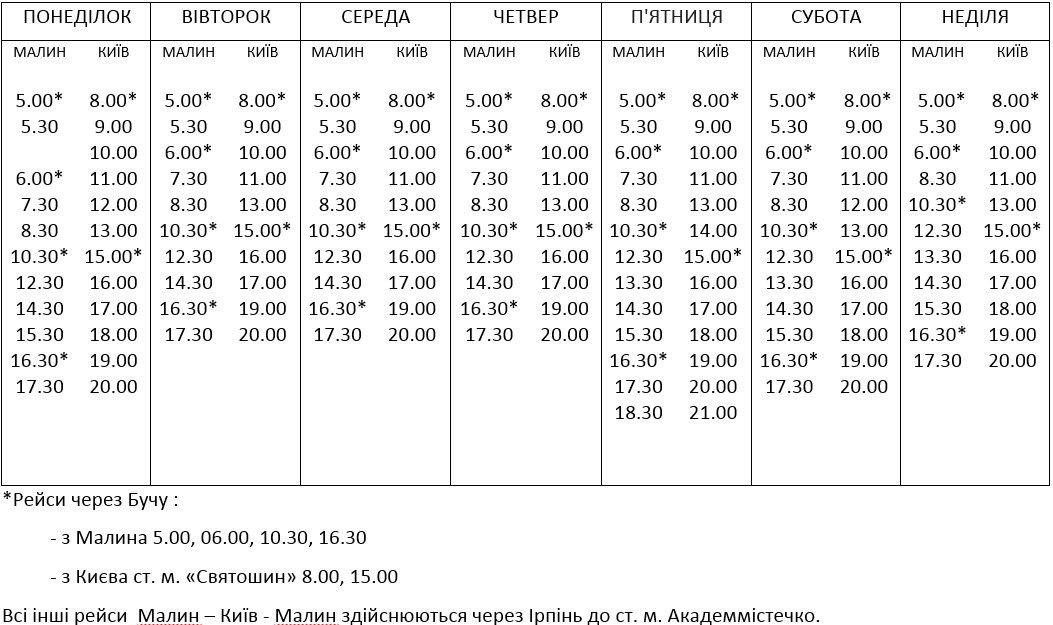 Рейси через Бучу з Малина: 5:00, 6:00, 10:30, 16:30