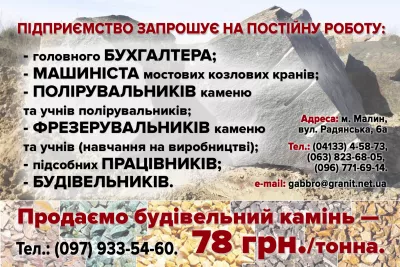 Підприємство запрошує на постійну роботу працівників наступних професій: — Головний бухгалтер; — машиніст мостових козлових кранів; — полірувальників каменю та учнів полірувальників; — фрезерувальникі...