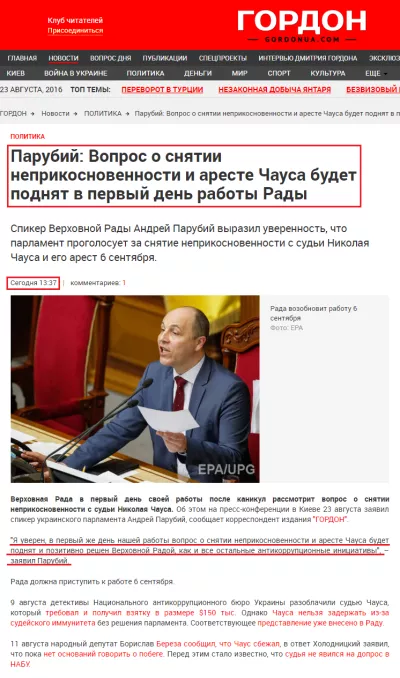 23 серпня 2016 року голова Верховної Ради України Андрій Парубій запевнив, що вже у перший день роботи нової сесії питання щодо позбавлення суддівської недоторканності та арешту Миколи Чауса буде розг...