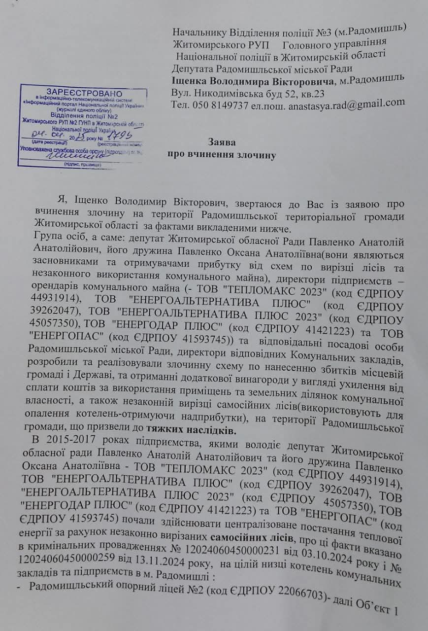 На сторінці "Радомишльська Варта" опубліковано скан-копію заяви про вчинення злочину, поданої депутатом Радомишльської міської ради Володимиром Іщенком до місцевого відділу поліції №2 (м. Радомишль).