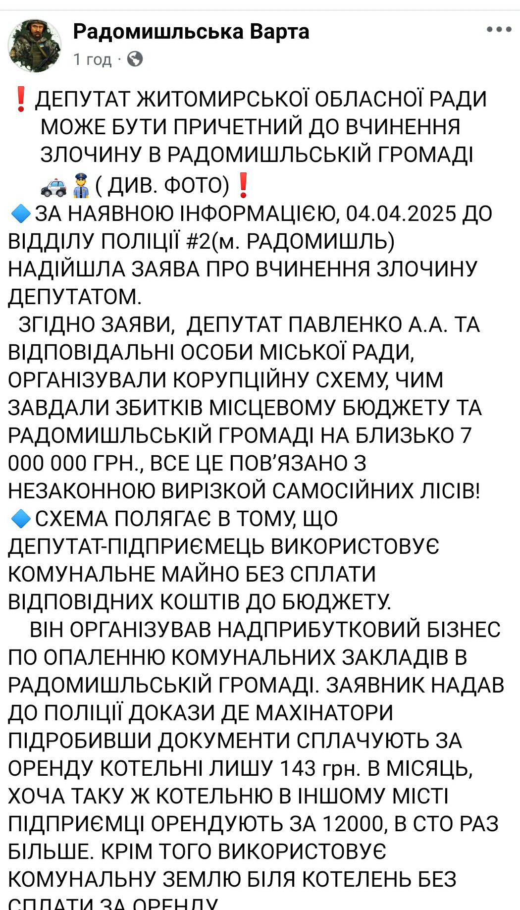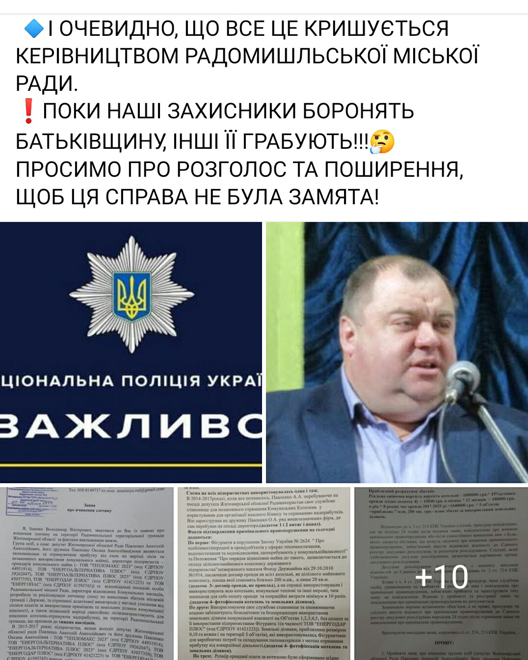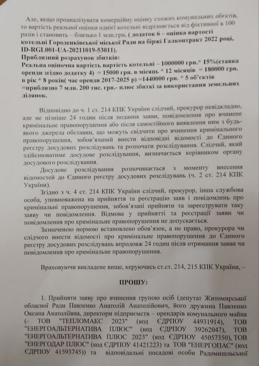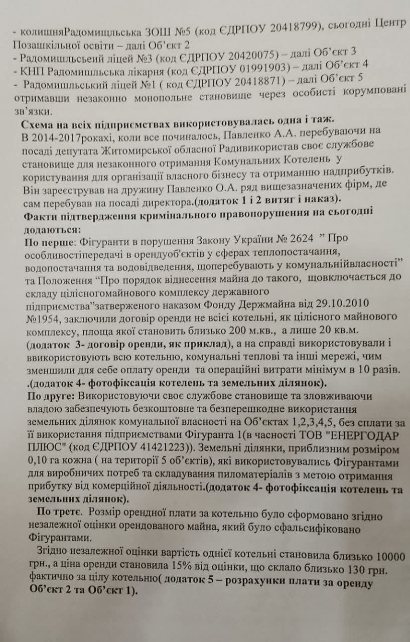 За інформацією, наведеною в заяві, депутат Житомирської обласної ради Анатолій Павленко разом із відповідальними особами міської ради організували корупційну схему, яка завдала збитків місцевому бюджету та Радомишльській громаді на суму близько 7 мільйонів гривень.