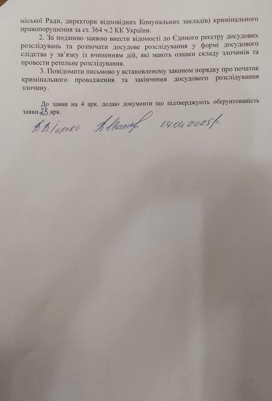 Заява про вчинення кримінального правопорушення надійшла до відділу поліції №2 (м. Радомишль) 4 квітня 2025 року. Володимир Іщенко просить внести відомості до Єдиного реєстру досудових розслідувань та розпочати досудове розслідування за ст. 364 ч. 2 КК України (зловживання владою або службовим становищем).