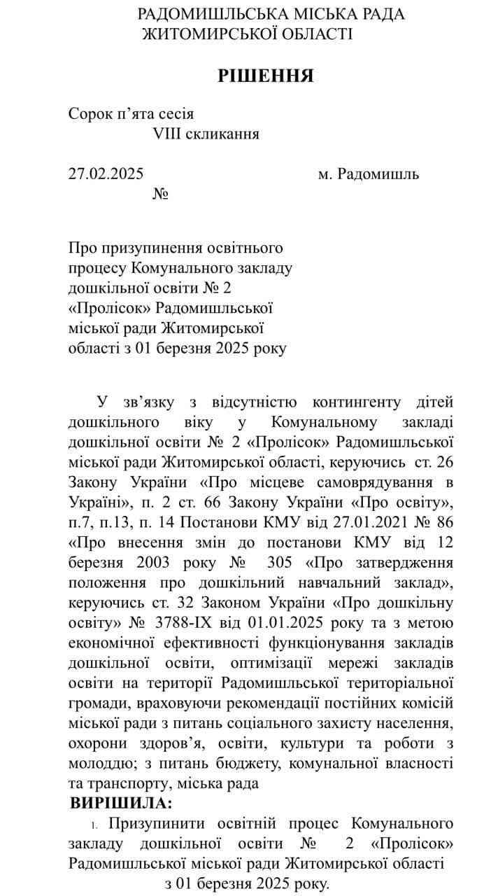 У місті Радомишль планується закриття дитячого садка №2 "Пролісок".