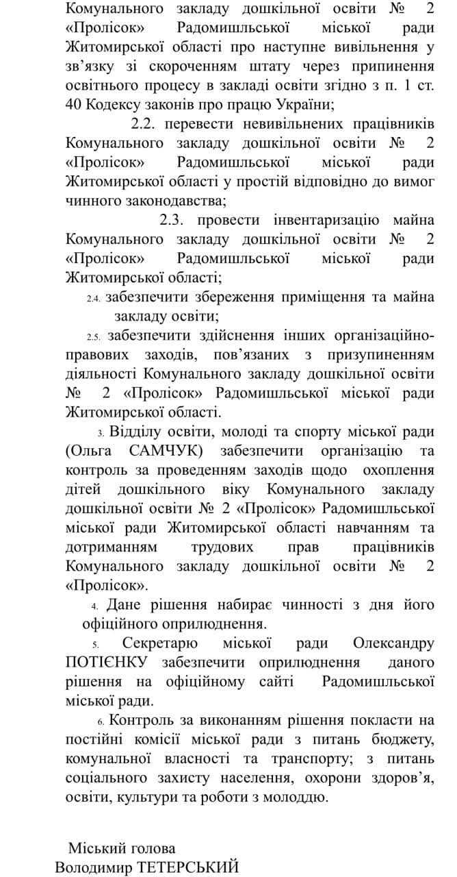 Документ також містить розпорядження щодо скорочення штату працівників дитячого садка та проведення інвентаризації майна закладу. Наразі невідомо, яка подальша доля чекає на приміщення дитячого садка та його майно після закриття.