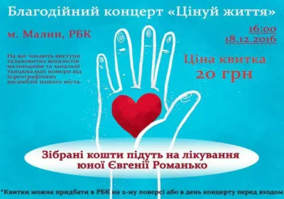 18 грудня о 16 годині у районному Будинку культури відбудеться благодійний концерт "Цінуй життя". На глядачів чекають виступи вокалістів Малинщини і танцювальні номери від хореографічних ансамблів міс...