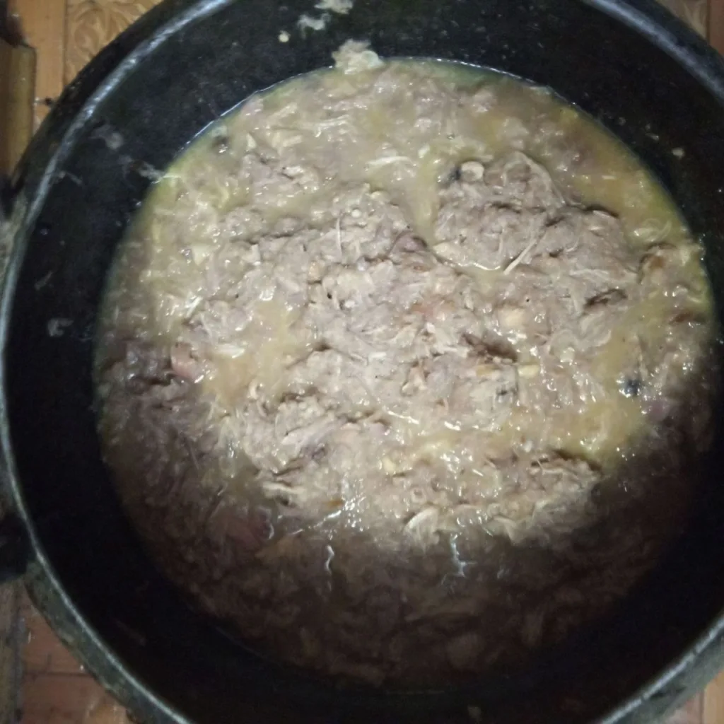 На наступний день охолоджене м’ясо потрібно розібрати, видалити кістки. На дно чугунця покласти часник, цибулю та дрібно порізане м’ясо. Посолити, поперчити, додати ще 150-200 мл води та знову поставити у піч для тушкування.