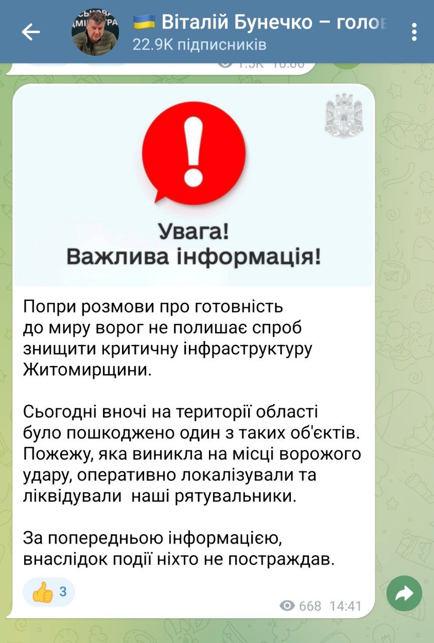 Про чергову атаку повідомив і голова Житомирської обласної військової адміністрації Віталій Бунечко. За його словами, попри заяви росії про нібито готовність до мирних переговорів, ворог продовжує цілеспрямовано знищувати об’єкти, важливі для життєзабезпечення регіонів.