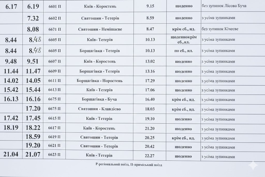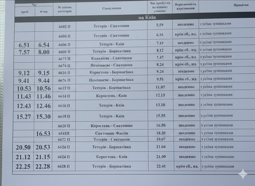 | 7:57 | 8:00 | 6608 | Тетерів – Борщагівка | 8:12 | крім сб, нд | з усіма зупинками |