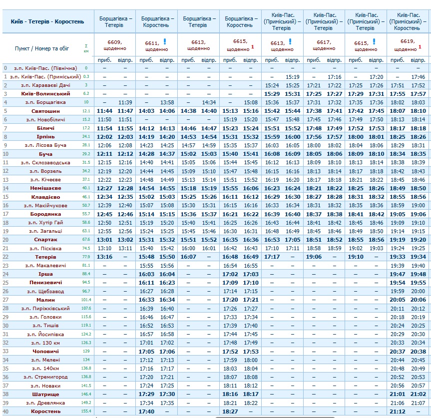 | 14.03 | 14.06 | 6611 П | Борщагівка - Коростень | 17.40 | щоденно | з усіма зупинками |
