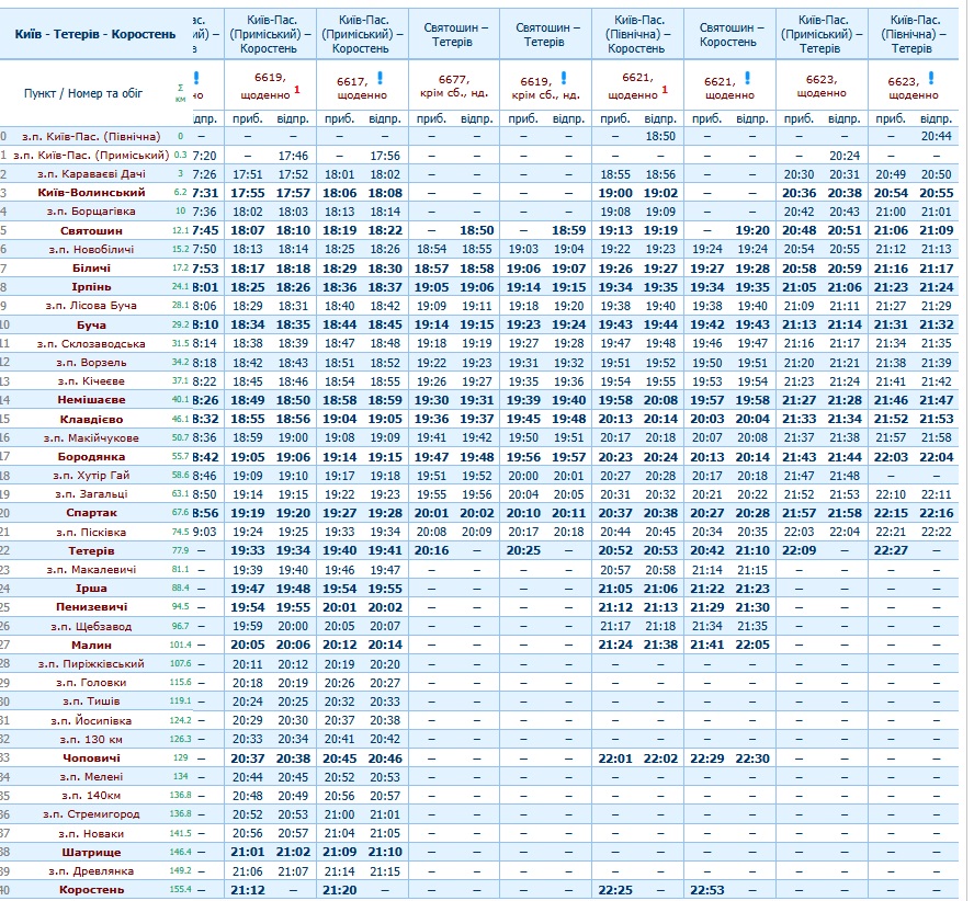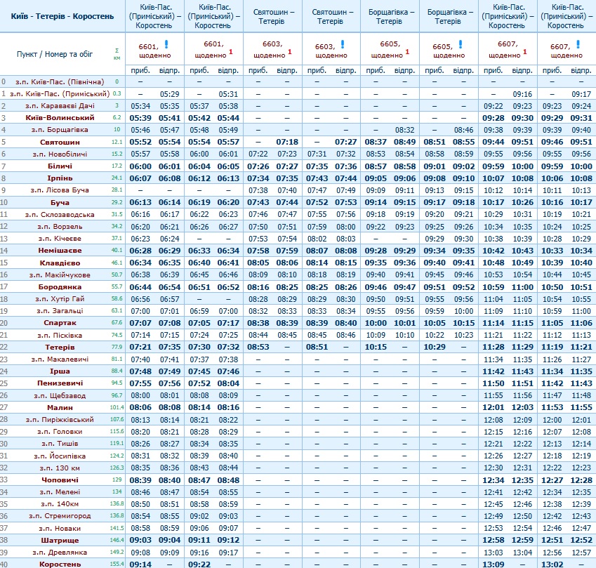 | 5.52 | 5.54 | 6601 П | Київ - Коростень | 9.14 | щоденно | без зупинок Лісова Буча |