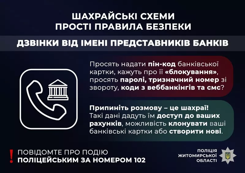 Житомирські поліцейські попереджають: виконання вказівок невідомих по телефону може призвести до значних фінансових втрат.