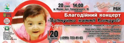 Благодійний концерт «Врятуймо життя Катрусі!», з метою збору коштів на операцію із трансплантації донорської печінки для восьмимісячної Каті Юрченко, організовують у Малині активісти БО «БФ «Волонтер...