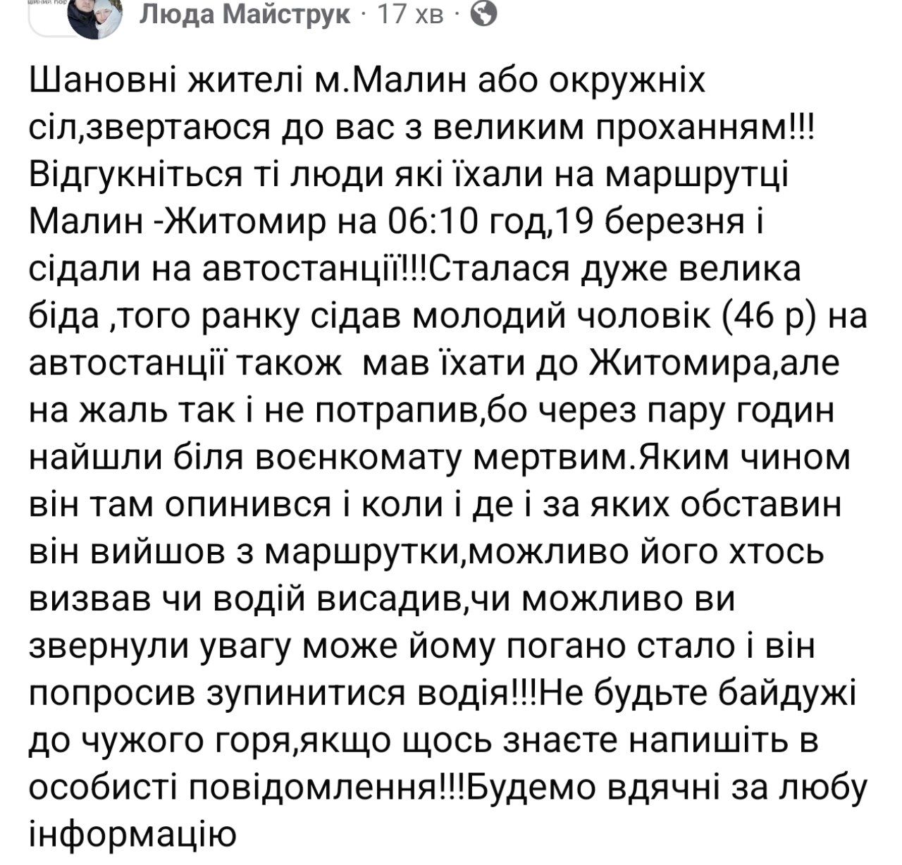 У соцмережах шириться звернення мешканки Малина, Людмили Майструк, яка закликає очевидців подій 19 березня допомогти з’ясувати обставини трагедії.