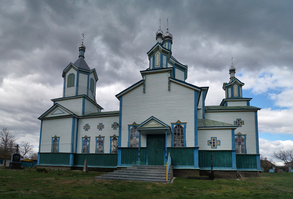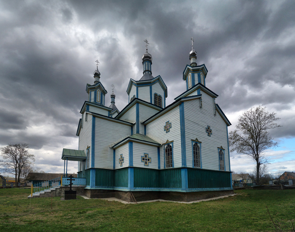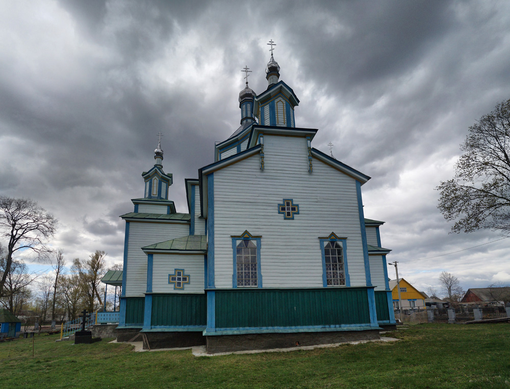 На протилежному березі Ірші ми побачили красиву дерев'яну церкву, про яку раніше не чули. Вона виглядала як звичайний єпархіальний проект з шатровими верхами, але мала додаткові декоративні куполи, що були характерні для дерев'яних храмів лівобережної України початку XX століття.