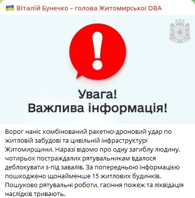 Голова Житомирської ОВА Віталій Бунечко повідомив, що ворог цілеспрямовано вдарив по житловій забудові. Станом на зараз відомо про одну загиблу людину.
