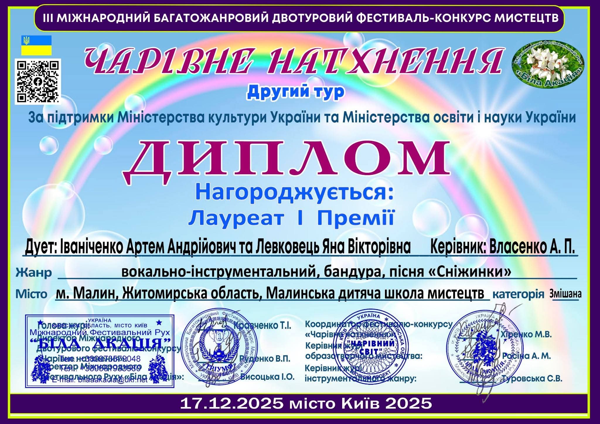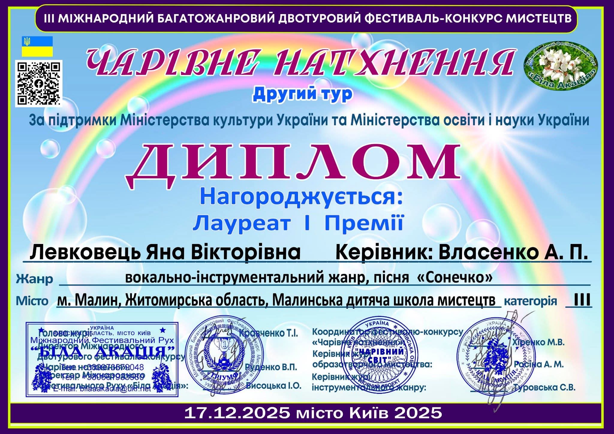 Учні Малинської дитячої школи мистецтв успішно представили заклад на ІІІ Міжнародному двотуровому багатожанровому конкурсі «Чарівне натхнення», здобувши найвищі нагороди.