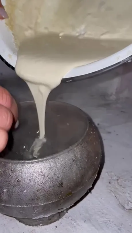 Тонкою цівкою вливайте вкисле тісто, постійно помішуючи, доки маса знову не закипить.