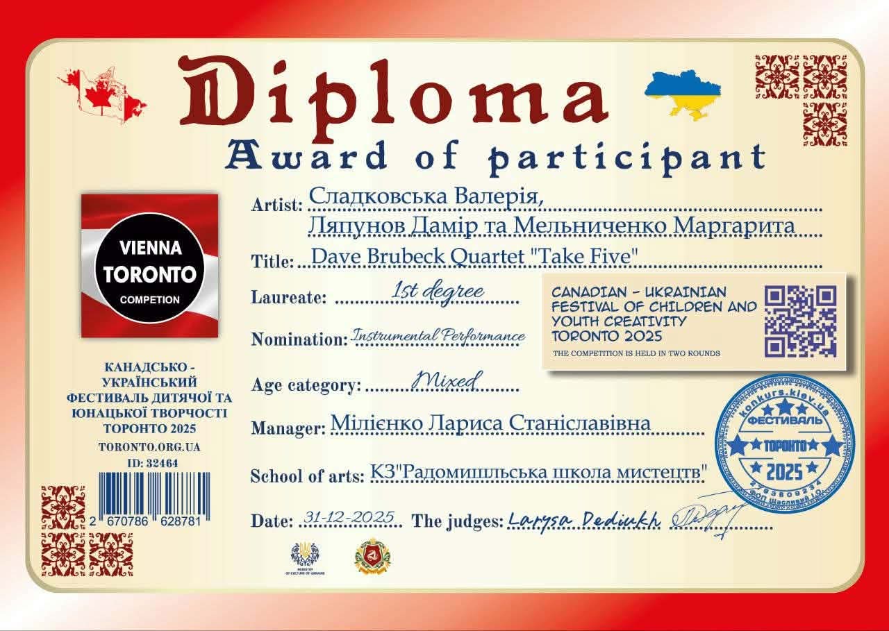 Інструментальне тріо учнів Радомишльської школи мистецтв — Маргарита Мельниченко, Валерія Сладковська та Дамір Ляпунов — вперше виступили на міжнародному рівні і гідно представили свій колектив під керівництвом Лариси Станіславівни Мілієнко.