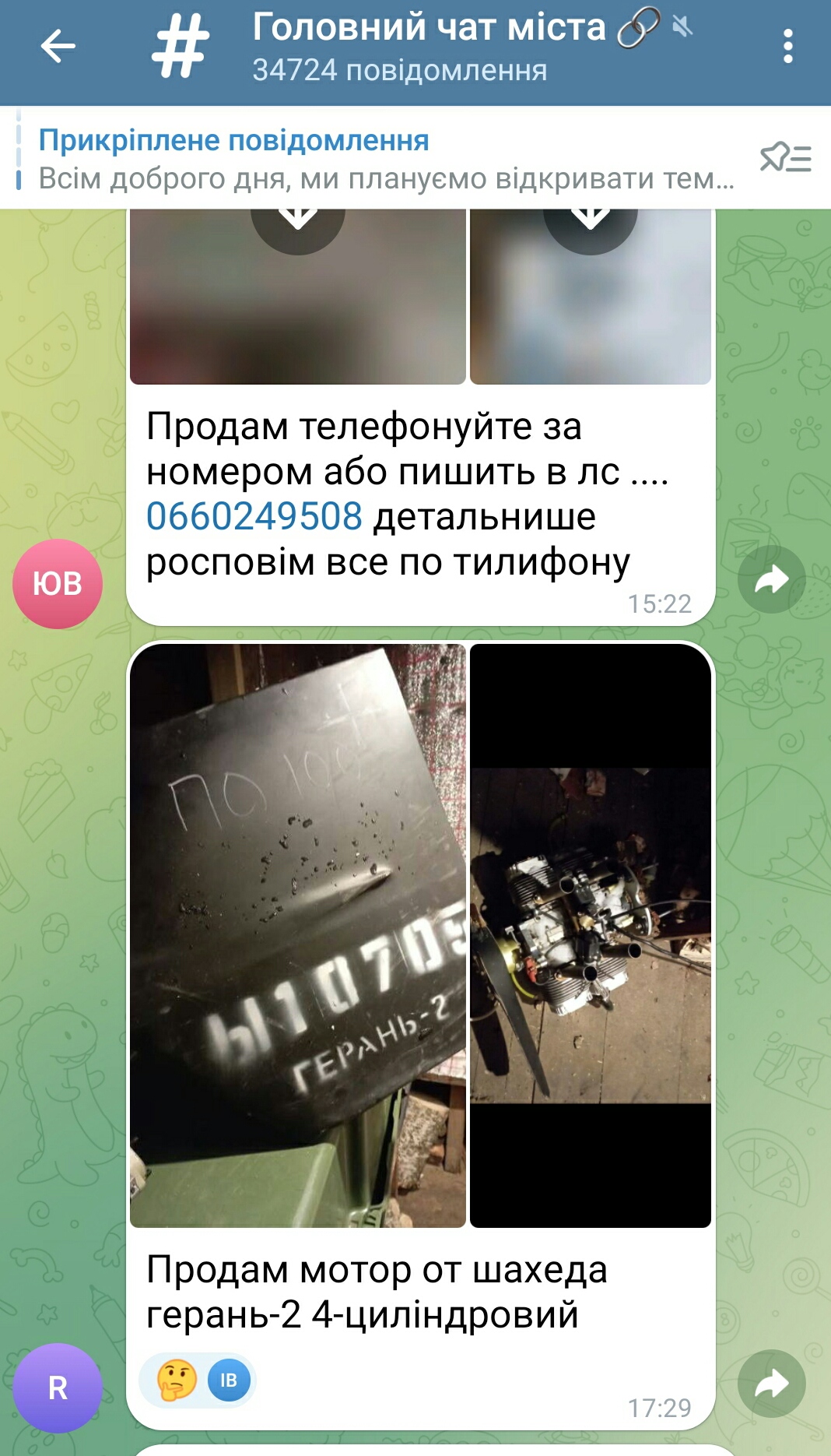 У групі "Малин допомога" з'явилося вкрай небезпечне оголошення - невідома особа намагається продати мотор від російського безпілотника-камікадзе "Герань-2".